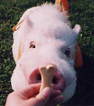 おすわり・・・『おすわり』と声をかけながら、鼻の頭にごほうびをちらつかせて上を向かせます。そしてご褒美を豚の重心が後ろに行くようにお尻のほうにずらしていきます。そしてお尻が床につくまで待ちます。最初は大体の形から入り、誉めてやりながら徐々に座らせて行きましょう。