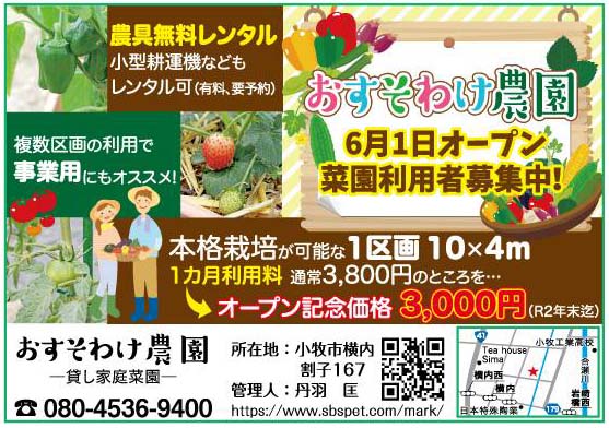| BSコーポレーションで貸し農園(家庭菜園向け)事業を始めました 趣味や余暇の過ごし方、無農薬野菜をめざす方に。また草食動物用の生牧草栽培に。 菜園者を募集中です。詳しくは下記のページをごらんください。 ![]() 詳しくはこちら https://www.sbspet.com/mark/index.html 繁殖ブリーダーさんへの野菜の提供や生牧草の販売、プレーリードッグの巣穴繁殖 も新規事業としてすすめています。 |