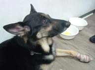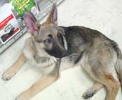 (2005年3月上旬) ★ムーちゃんが訓練所に入り5ヶ月が経とうとしています。勤務の忙しさで時折彼女の存在をふっと忘れてしまうことも有りましたが 約1名、シェパードの禁断症状に耐えられなくなり(社長です)とうとう代わりのシェパードをムーチャンを預けている訓練所から連れ てきてしまいました・・・。彼女の名前は「アイちゃん」競技会で優秀な成績を収めた事もあり、また父親もドイツの由緒ある血統のシ ェパードです。誰にでもフレンドリーで心優しい、まさにシェパ界のやまとなでしこ?しかしそんな彼女の弱点は・・・食い意地が非常 に強く食べても食べてもまだ足らない、挙げ句の果てには、ゴミ箱をあさり、盗み食い、怒れば隠れる・・・スタッフ一同「これがなけ れば完璧なのに・・・」とため息の日々が続きそうです。 ←シェパードのアイちゃん。ムーちゃんの座を奪う!? |