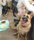 (2006年8月下旬) ★相変わらず元気一杯なムーチャンと食欲旺盛なアイちゃんですが、2匹の間にはどうも微妙な関係があるみたいです。もともと犬同士仲が良くても、あまりくっつかないみたいで、特にシェパードはその傾向が強く出るみたいです。2匹を遊ばせるとかなり激しいじゃれ合いもしますし、ご飯も同じ器に顔をつっこんで仲良く食べますが、ちょっと一休みするときや、寝る時は2匹とも境界線が決まっているように、大体同じ距離を開けるようです。1匹1匹がとても個性的な犬種ですが、2匹が一緒になるとこのような現象が起きるのはチョット不思議な物ですね。あるスタッフ曰く「ここにシェリーが加わったらどうなるのかな?」と言っていましたが、会社が破壊される事は間違いないでしょう。(おそろしや〜) |