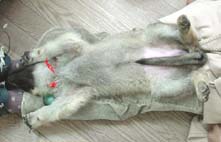 (2005年4月末) ★アイちゃんとのお別れの日、訓練所にてムーちゃんの卒業訓練試験を少し拝見する事ができました。大きな障害物をジャンプで越 えたり、訓練士の方の命令に従ったりとなかなかのものでした。全てが終わりいよいよアイちゃんを訓練所の方に渡すとき、訓練士の 方が「アイちゃんどうでしたか?」社長「とっても良い子で短い間でしたが、愛着がわいてしまいましたハハハ・・・・」訓練士の方「そう ですか、もしよろしければ是非アイちゃんも引き取ってあげられないですか?」社長「エーッ!(半分うれしそうな声)良いのですか?」 訓練士の方「この子は集団生活になじめないタイプの子で・・・とても可愛がって頂いたみたいなのでよろしければ是非」・・・・と言うこ とでアイちゃんも当社のアイドルになってしまいました。ムーちゃんとの折り合いも良く、2匹のじゃれ合いは正直迫力があります。 でも一番喜んでいるのは、社長かな? ←ただ今熟睡中。 |