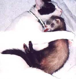 他の動物の時ほど心配は必要はありません。すぐに仲良くなります。(相性が悪くて仲良くなるのに数ヶ月かかったという例もあります)。しかし最初の出会いは配慮してあげてください。しばらくの間は別々のケージにいれて隣同士においておき、1日に数回、飼い主が見守っている中で一緒にさせてあげるのがよいでしょう。使っているタオルや寝袋、ハンモックを交換して臭いに慣れさせるのも方法です。ゆっくりと仲良くさせてあげてください。最初のうちは自分の優位性を主張しようと噛み合ったり、戦闘ごっこして遊んだりしているうちに手加減を忘れる場合がありますのでしつけてあげてください。とにかく最初のうちは目の届くところで一緒にしてあげてください。仲良くなったら一緒のハンモックで寝たり、じゃれあって遊ぶ姿を見るのはとても楽しいものです。うんちの量は2倍になりますが。それから平等にかわいがってあげてください。かまってもらえない子は嫉妬したりストレスがたまったりします。もし初めてフェレットを飼う方ならば最初から多頭飼いはやめた方がいいでしょう。最初は1匹から始めた方がしつけもうまくいくようです。フェレットはとても社交的ですので、 遊び仲間がいるとストレスも溜まらないので人に噛むことも少なくなり、楽しい生活になります。
