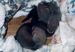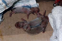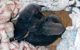 30日目(写真) 体重199〜245g 体長18〜19cm 目が少し開いてきた。トイレも自分で行くように なった。 34日目 体重220〜270g 体長19cm 両目がぱっちり開いた。まだ見えてはいないよ うだ。3匹ともじゃれて遊んでいる。 |