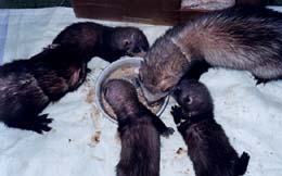 フェレットの母乳は、固形分23.5%、脂肪分34%、タンパク質25.5%、炭水化物16.2%で構成されています。育児放棄した場合には、これに近いペット用のミルクを使用します。授乳後はベビーの肛門を軽く刺激して排便を促すようにします。