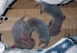 1日目(写真) 体重9〜10g 体長3〜4cm 手、足、尾、の先以外に白い毛が2〜3ミリ生 えている。 2日目 体重12〜15g 体長7cm 目の部分が黒っぽくなって体もグレーかかった。 薄皮が少し向けている。よく泣いている。 |