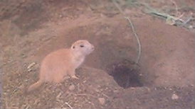 (プレーリードッグは集団性があり穴掘りが大好き、尻尾の先が黒いのがオグロ)