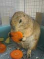 ペレットは堅い固形状のもの(歯の伸びすぎを防ぐ)で高繊維質のものを主食として与えるようにします。主食ペレットの与える量は1日50〜80gが目安。プレーリードッグ用と記載されていても成分が不適切な市販フードもありますので、成分をよく確かめる必要があります。特にアルファルファが原料に使用されているフードはタンパク質が多すぎるためプレーリードッグの主食には不適切です。