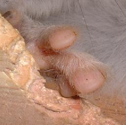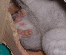 すばしっこくなったちびは、天井を開けると同時に、天井のドームに入り込んで来ました。ぴょんぴょんと飛び跳ねて、やっぱり「うさぎ?」って言われるだけあります。 ランランと同じものをかじれるんだけど、まだオッパイ飲んでます。 右はちびの後ろ足の肉球です。やっぱりピンクだ〜 |