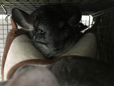 今日は冷え込むのでケージの上に湯タンポを置いてやると暖かい場所を占領するモモ。