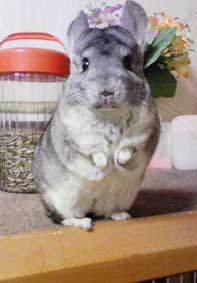 | 我が家には、現代6匹の、チンチラ家族が住んでいます。 皆仲良しで私たちを和やかにしてくれています。 目に入れても痛くないほどの可愛さです。 最初は7匹そのうち5匹は我が家で生まれた子供でしたが、今年6月に最も懐いていたモコ君4歳(父親)が、ちょっとした私の不注意から怪我をさせてしまいました。 原因と言うのは、この4年間いつもおこなっていた散歩の際のことですが、何時もおとなしいモコ君が立っていた私の腕の中から何かに驚いたのか急に飛び降りてしっまたのです。 運が悪いと言うのか飛び降りたところが、フローリングだったので,顔から落ちて、口の中から出血。 手当ての甲斐なく死んでしまいました。 まるで数日間我が子が亡くなってしまった悲しみでした。 ここで経験したのは、いくら懐いていてもむやみに高い所で、絶対に、抱っこしないことだと思いました。 チンチラは頭が大きくて手が小さい、どうしても顔から落ちてしまうのでしょう。抱っこも座ってする事にしました。 チンチラの飼育上当たり前の事だと思われますが、私たちの様な事が、おきないように心がけてやってください。