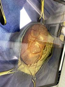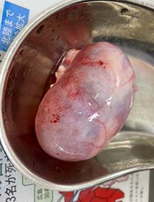 左からお腹が膨らんでいる様子、手術中、摘出した腎臓と尿管(中に尿溜まっている)、術後がとても元気になりました