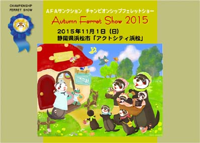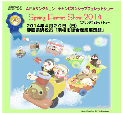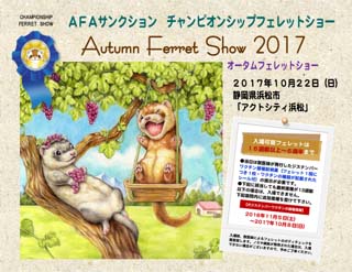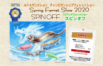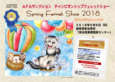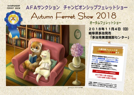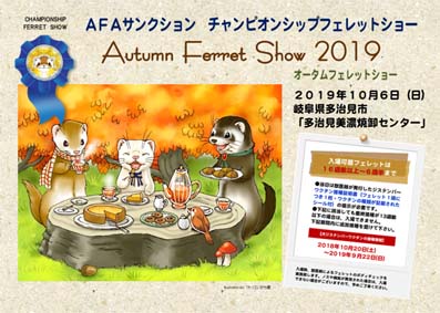 【イベント予告】 ![]() ■「Spring FerretShow 2020」スピンオフ開催のご案内 ライジング・サン・フェレットショー実行委員会では、2020年6月28日(日)までの期間限定で オンライン上で開催可能なイベントを計画しています。 ※随時、イベント開始をご案内させていただく予定です。 ※詳しくは、「SpringFerretShow 2020 スピンオフ」のページをご覧下さい。 http://risingsunferretshow.web.fc2.com/springferretshow2020spinoff.html 【イベント報告】 ![]() ■フェレットショー「Autumn FerretShow 2019」 ライジング・サン・フェレットショー実行委員会 2019年10月6日(日)AFAサンクションでのフェレットショー ●会場:岐阜県多治見市「多治見美濃焼卸センター」 大ホール ●時間 午前10:00〜午後7:00 ※エントリー者チェックイン 午前9:00〜10:00 ●入場料 一般…500円 小学生以下…無料 ※フェレット同伴可(16週齢以上〜6歳半まで) 入場時に獣医師によるフェレットのボディチェックがあります 獣医師が発行したジステンパーワクチン接種証明書 (フェレット1頭につき1枚)をご持参下さい。 【エントリーについて】 エントリー期間 前期: 8月 4日(日)〜8月18日(日) 後期: 8月19日(月)〜8月31日(土) ※エントリー期間により、エントリー料金が変わります。詳細は、エントリーページをご確認下さい。 詳細はこちら http://risingsunferretshow.web.fc2.com/autumnferretshow2019.html 【イベント報告】 ![]() 2018年11月4日(日) フェレットショー「Autumn Ferret Show 2018」 岐阜県多治見市「多治見美濃焼卸センター」 お客様の投稿より 写真館プリンちゃんコンパニオンジルで2位取りました。インスタ映えのやつ撮って楽しかったです。 ![]() ![]() 当店の出店ブースで「グッズ販売」と「ゲーム」「撮影会」を行いました。 たくさんの参加をありがとうございました。