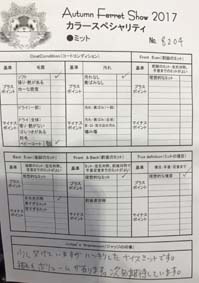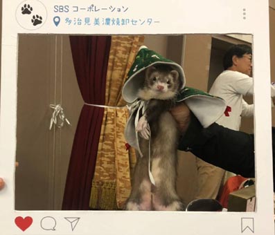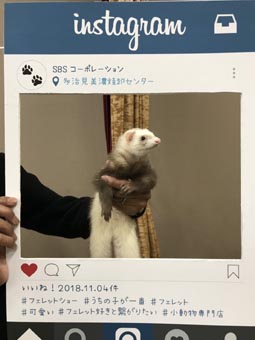 【イベント報告】 ![]() 2018年5月6日(日) フェレットショー「Spring Ferret Show 2018」 岐阜県多治見市「多治見美濃焼卸センター」 お客様の投稿より 先月5月6日(日)春のフェレットショー2018に茶丸を連れて行ってきました。 タイトルクラス コンパニオンシニア部門でベストインショーをいただきました。 ![]() ![]() 【イベント報告】 ![]() 2017年10月22(日) 「Autumn Ferret Show 2017」 会場:静岡県浜松市「アクトシティ浜松」 お客様の投稿より SBSコーポレーションさんで購入したシルバーミットの子が賞をとりました! ![]() ![]() ![]() お客様の投稿より いつもお世話になっております。先日Autumn Ferret Show 2017へ行ってきました。SBSさんで茶丸をお迎えしてから4年が経ち、コンパニオンシニアという4歳〜6歳半未満の部門でエントリーした結果、タイトル1,2で1位、タイトル3で7位入賞でこの部門の総合優勝が頂けました。ショーに参加する度に飼育の仕方やお手入れ、遊び方などアドバイスをもらい、毎日楽しく過ごす事が出来ています。これまでは大きな病もありませんでしたが、病気が多くなると言われる年齢に入りました。また遊びがてらショップにお伺いしますので相談させていただく際は宜しくお願い致します。 ![]() ![]() 【イベント報告】 ![]() 2015年11月1日(日) フェレットショー「Autumn Ferret Show 2015」 会場:静岡県浜松市「アクトシティ浜松」 お客様の投稿より 丹羽さーん、おはようございます。昨日はフェレットショーへまたまた行ってきました〜。 SBSスタッフの方がプライベートで来ていて挨拶してもらいました(^^) 嬉しかったです、ありがとうございましたとお伝え下さいっ。 コンパニオンアダルトホブのクラスでRING 1で9位、RING2で2位、RING3で3位と各RINGでは1位が無かったものの、茶丸見事ベストインショーをいただきましたっ!(このクラスの合計点1位) 春のフェレットショーに引き続いて二連覇しちゃいました笑 ![]() お客様の投稿より 先日のフェレットショーでSBSさんでトリミングしてもらった子が、コンパニオンアドレッセント(1才未満の部)で総合優勝しました!!本当にありがとうございました!遅れましたが報告させていただきます! ![]() ![]() 【イベント報告】 ![]() 2015年4月19日(日) フェレットショー「Autumn FerretShow 2014」 会場:静岡県浜松市「浜松市総合産業展示館」 お客様からの投稿より いつもお世話になります。昨日浜松市で行われたフェレットショーへ行ってきましたっ! 15日(水)にSBSでシャンプーフルコースのおかげか、うちの茶丸がプレミアコンパニオンクラスで2位(15匹中)、アダルトコンパニオンホブのリング1とリング2で1位→総合1位(33匹中)で小さいクリスタルの盾2つと大きい盾1つもらってきました。 夫婦二人共とても喜びましたよ。 ショップの出店があれば、一緒に喜べたのになと思いました(^ ^) ありがとうございました。 今後とも宜しくお願い致します。 ![]() 【イベント報告】 ![]() 2014年10月19日(日) フェレットショー「「Autumn FerretShow 2014」 会場:静岡県浜松市「アクトシティ浜松」 【イベント報告】 ![]() ![]() 2014年4月20日(日) フェレットショー「Spring FerretShow 2014」 会場:静岡県浜松市「浜松市総合産業展示館」 当店の出店ブースで「フェレットグッズ販売」と「ボール投げゲーム」を行いました。 たくさんの参加をありがとうございました。景品GETよかったですね。楽しかったですね。