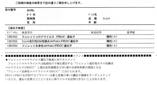 コロナウイルスは現時点においても詳細が不明な、しかしながら昔からいわゆるグリーンウイルスとして知られていたウイルスです。ネコのFIPウイルスと親戚関係のウイルスであり、猫の場合にも治療法がないのと同様にフェレットにおいても有効な治療法がなく、非常に厄介なものと思っています。最近まではウイルスの検出方法が大学の実感室レベルであり信頼性を欠く状況でしたので私はウイルス検出目的の検査は実施せず、臨床症状と血液検査所見からの推定での診断を行っておりましたが、今年になってから、マルピーライフテック株式会社という検査センターが商業的に検査を実施してくれるようになりましてので、今後はこの検査センターを利用してウイルス検出による確定診断を行うことができるようになっています。しかしながら、確定診断がなされても、治療法がないのは変わりません。これまでと同様に対症療法のみとなります。