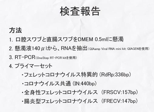 大事な点は、昔からある病気であって決して最近新たに発生した病気ではないことだと思います。確かにこれまでも下痢が治らずに命を落とすフェレットはいましたが、そのような場合が今後において増えるわけではないということだと思います。あえて言えば、不幸にして下痢症状が治らずに命を落としたフェレットの飼い主にとって、原因不明の難治性下痢ではなく、その原因がコロナウイルス感染であると理解していただけるようにこれからはなるということでしょうか。