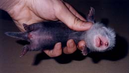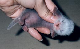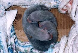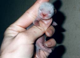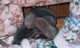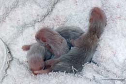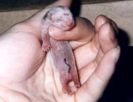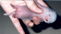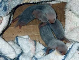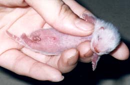 1日目(写真) 体重9〜10g 体長3〜4cm 手、足、尾、の先以外に白い毛が2〜3ミリ生 えている。 2日目 体重12〜15g 体長7cm 目の部分が黒っぽくなって体もグレーかかった。 薄皮が少し向けている。よく泣いている。 |