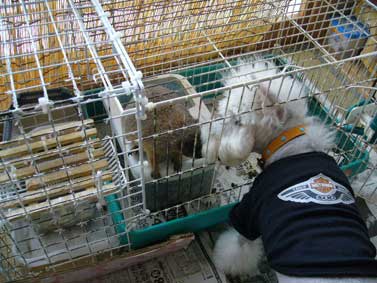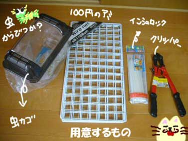 ベースはうさぎ用ゲージです。百円ショップのネットをインシロックでとめた物で増築。