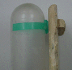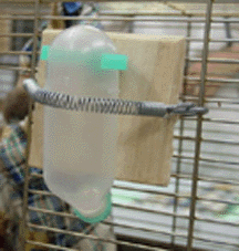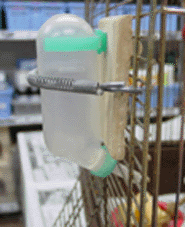 | チンチラがウオータボトルを囓ってしまい、ゲージ内が水浸しになったことはありませんか。これは簡単に作れるウオーターボトルガードです。 ゲージの網み目に合わせた細い木と、ボトル全体をガードする大きめな木の板を用意してください。後は合わせるだけです。木が囓られたらまた新しいものを作ってあげてください。 また合板は木に接着剤を使用していますので、あまりオススメできません。 |