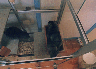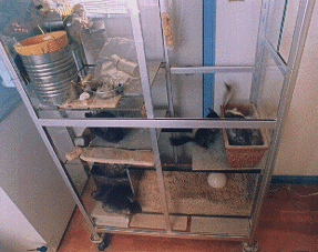 一番下の階には、水槽(上部半分の蓋として30cm角の大き目のタイルを置いてます)とコンクリートブロック、そして、その上にトイレ箱です。 今年、4と5月に合計5匹の子供が生まれ、そのなごりで、水槽とコンクリートブロック入っています。生後1ヶ月までは、水槽内にコンクリートブロックを入れ、今ある方には、これより厚いコンクリートブロックがありました。 それぞれ個々に、巣穴が有った為、最初の子供や親が、後の子をいじめる事は有りませんでした。 |