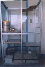 このゲージの利点として、 1.砂が余り飛び散りません。(普通のゲージの1/10以下です)、 2.尿なども外に飛び散りません。 3.チンチラの足の怪我の心配がなくなります。 (三角飛び等で側面を使うので、網のゲージの様に網に引っ掛ける事) 4.手入れも楽だし、衛生的にも良(ガラスクリーナで拭くだけ) 5.水槽内に、ペットボトルの水を凍らしたものを入れていますが、融けるのが遅く長持ちします。などです。 よく、換気等心配されますが、来年の1月で3年目ですが、問題ありません。もし心配なら、天井の板を、少しずらすと良いと思います。 |