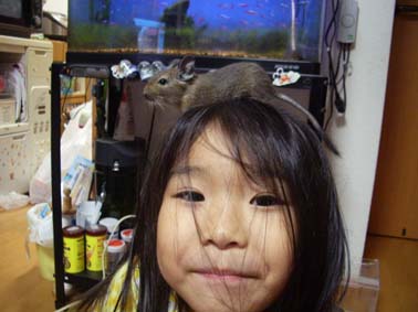 クリリンは、今日もあーちゃんの頭に乗って遊んでいます。