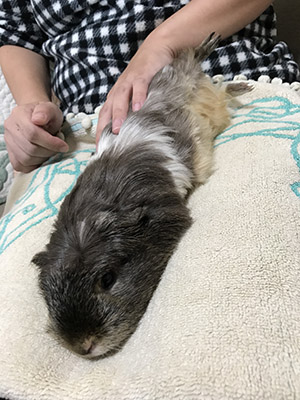 体を捻ってお腹を見せる抗議のポーズのもっぷ君。