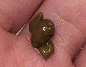 育児袋が炎症で赤くなることがあります。お手入れのときに雑菌で炎症をおこすことがあります。また、袋の中でベビーが死亡した場合も同じ現象がおきます。かゆがっていたり、すごく気にするようでしたら、動物病院で確認してもらいましょう。妊娠の可能性がなくて、少し赤いだけなら様子をみてもいいでしょう。 ![]() フクロモモンガは果物などのナマ餌が多い為、便の形態が不安定です。またミルクを与えると健康でも軟便になります。手の上に乗せていると肛門が刺激されて排便される便は軟便でも異常ではありません。水っぽい下痢便に注意してください。 正常な便の形状はバナナ形で、指で軽く摘むと潰れ臭いは少ないです。色は薄茶〜こげ茶・黒(食べている物により変化する)です。異常な便はペースト状〜水様便、悪臭(生臭さ)を発します。また尿道・肛門付近や生殖器周りが血や分泌物で汚れている、または、それらが敷材に付着している場合、内臓系疾患や生殖器系疾患、泌尿器系疾患が考えられます。 これらの疾患は重症化しやすいので、早急な処置が必要です。また一部の内臓疾患は人畜共通の感染症があります。 ![]() ![]() 左は正常便、右は軟便(刺激されて排泄された正常便) ![]() ![]() 下痢が続いたり、消化できないものを食べると脱腸(または脱肛)をおこすことがあります